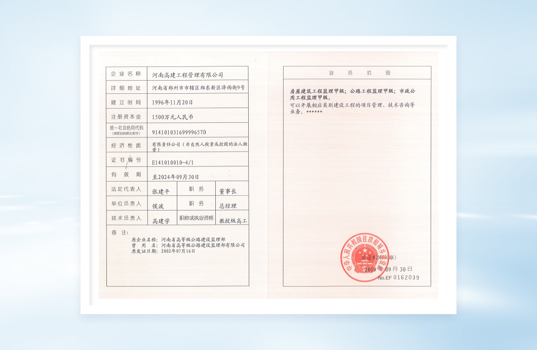 河南高建工程管理有限公司是全國(guó)首批12家公路甲級(jí)監(jiān)理企業(yè)之一,為設(shè)研院的二級(jí)獨(dú)立法人企業(yè)。公司自1991年初開(kāi)始從事公路工程的施工監(jiān)理及咨詢(xún)工作,經(jīng)過(guò)30余年的磨礪,現(xiàn)已發(fā)展成為一家擁有“監(jiān)理行業(yè)較全資質(zhì)體系、全過(guò)程工程咨詢(xún)服務(wù)能力”的工程顧問(wèn)服務(wù)型企業(yè),專(zhuān)業(yè)覆蓋公路、市政、房建、水運(yùn)、水利等多個(gè)領(lǐng)域,依托公司及設(shè)研院結(jié)構(gòu)完善、穩(wěn)定的高素質(zhì)技術(shù)團(tuán)隊(duì),可為客戶(hù)提供工程監(jiān)理...